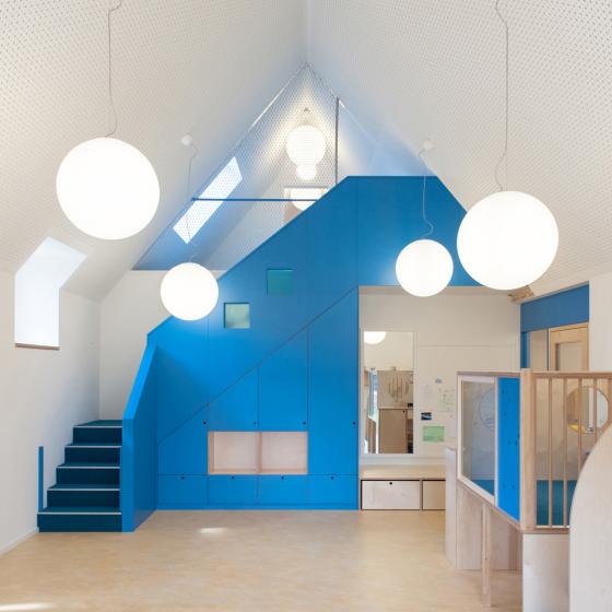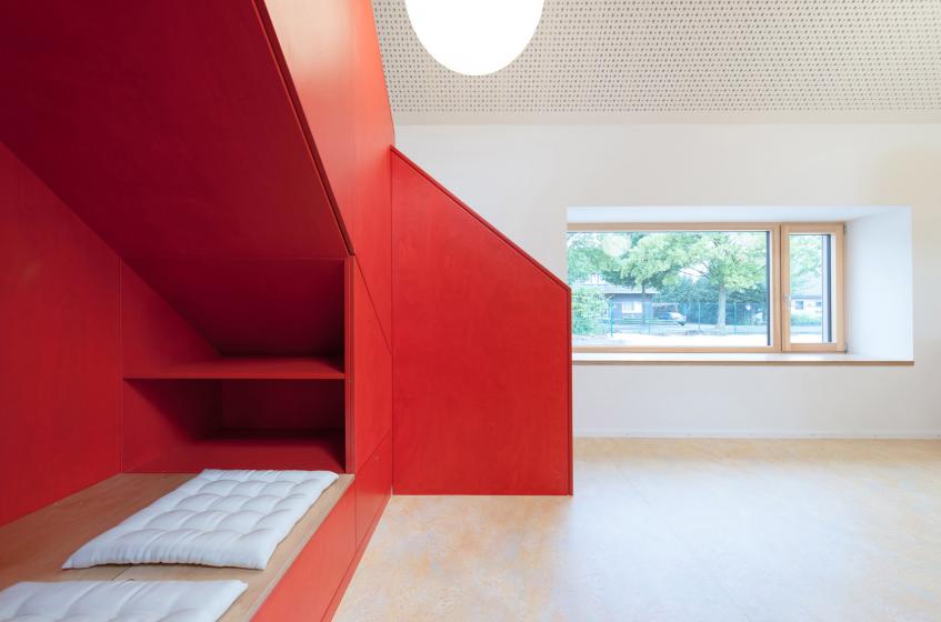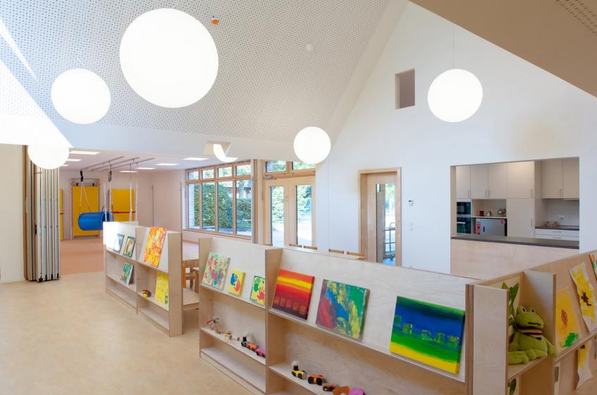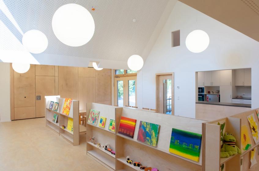 Man betritt das Gebäude parallel zum Mehrzweck- und Frühstücksraum. Durch die Organisation des Grundrisses und eine klar definierte Wegeführung ist das Gebäude intuitiv zu verstehen. Die Flure sind zu Spielflächen aufgeweitet. Sie werden zu den Gruppenräumen hin durch die Positionierung der Garderoben und die verglasten Giebel betont. Die Gruppenräume sind mit den Sanitärbereichen gut organisiert. In den Gruppenräumen wird das Raumvolumen bis ins Dach genutzt. Die Flächen über den Intensivräumen sind Galerieebenen.