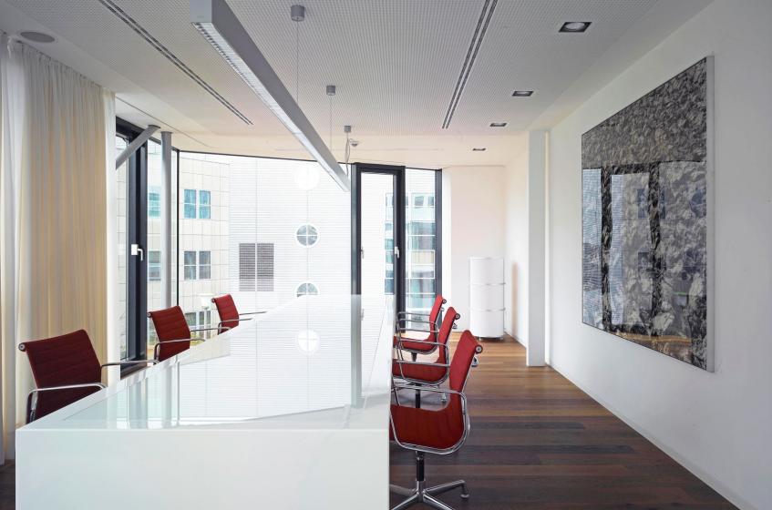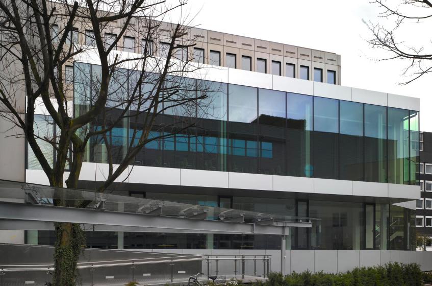 Die Raumfolge Innenhof-Foyer-Halle schafft eine vollständige Querverbindung durch die Verlängerung in der Gebäudefuge zwischen BT3 und BT1 bis zum Kolde-Ring. Hierdurch erhält der Bereich eine faszinierende Großzügigkeit. Durch die räumliche und funktionale Verknüpfung des Sitzungssaals und der Seminarräume mit der bestehenden Struktur des Gebäudes kann ein Konferenzbereich mit hoher Flexibilität und Atmosphäre geschaffen werden.