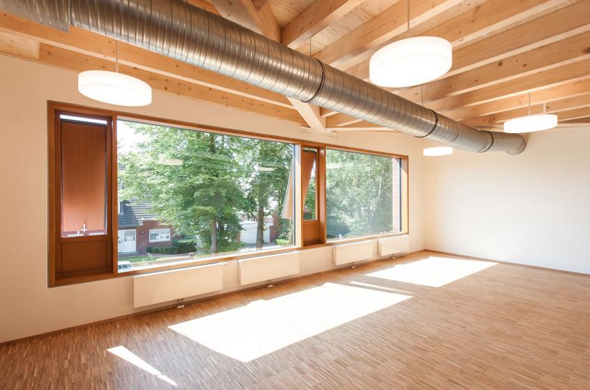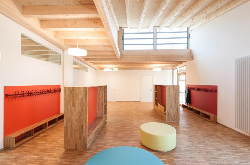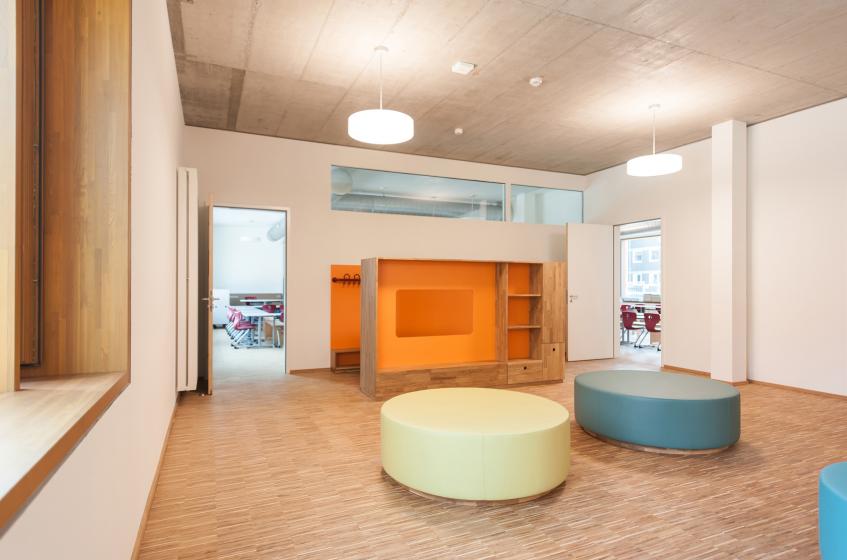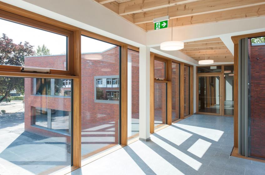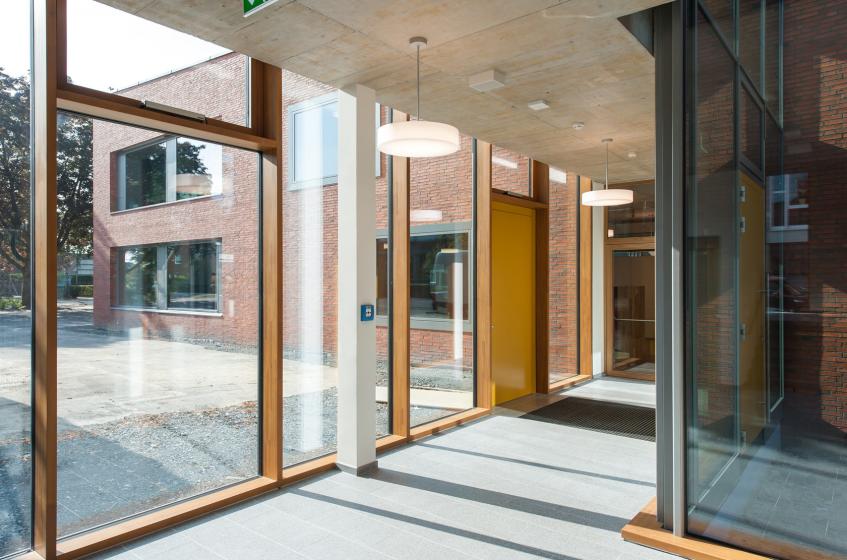 Das bestehende Ensemble der Mariengrundschule wurde durch ein neues Schulhaus mit 8 Klassenräumen ergänzt. Positioniert entlang der Straße fasst das neue Klassenhaus den vorhandenen Schulhof und schafft einen geschützten Platz im Bereich des Haupteingangs. Mit diesem Schulhaus zeigt sich die Grundschule mit einen neuen modernen Gesicht zur Stadt. Ortsüblicher Klinker ermöglicht eine harmonische Einbindung in die Umgebung. Das leicht gefaltete Dach sorgt für ein spannungsreiches und individuelles Volumen. Die Klassenräume gruppieren sich um eine Aufenthaltsfläche, die mit ihrer Art der Möblierung einen Bereich für Kommunikation, aber auch Rückzug oder einfach nur Erschließung schafft. Ein Glasgang verbindet zurückhaltend und barrierefrei das neue Klassenhaus mit dem Bestand.