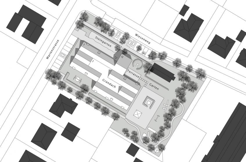Der Entwurf reagiert auf die Maßstäblichkeit des Ortes und entspricht den Vorgaben der Auslobung. Durch die Strukurierung des Gebäudekörpers besteht die Möglichkeit auf die vorhandene Bebauung im Quartier zu reagieren. Ein markanter, zweigeschossiger Gebäudekörper schiebt sich aus der Nordfassade, so entstehen ein klar definierter Eingangsbereich und Außenräume mit klarer Zuordnung zu den Gruppenräumen. Beim Umlaufen des Gebäudes vermittelt der Wechsel zwischen engen und weiten Räumen ein spannungsvolles Raumerlebnis.