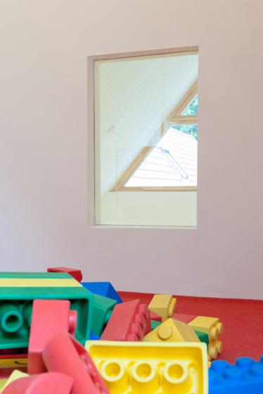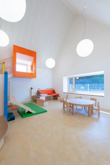 Man betritt das Gebäude parallel zum Mehrzweck- und Frühstücksraum. Durch die Organisation des Grundrisses und eine klar definierte Wegeführung ist das Gebäude intuitiv zu verstehen. Die Flure sind zu Spielflächen aufgeweitet. Sie werden zu den Gruppenräumen hin durch die Positionierung der Garderoben und die verglasten Giebel betont. Die Gruppenräume sind mit den Sanitärbereichen gut organisiert. In den Gruppenräumen wird das Raumvolumen bis ins Dach genutzt. Die Flächen über den Intensivräumen sind Galerieebenen.