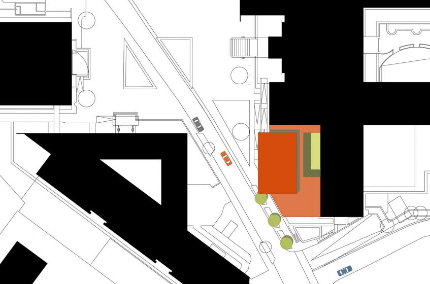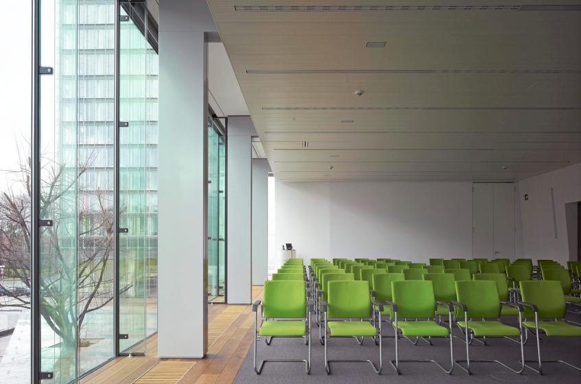 Die Raumfolge Innenhof-Foyer-Halle schafft eine vollständige Querverbindung durch die Verlängerung in der Gebäudefuge zwischen BT3 und BT1 bis zum Kolde-Ring. Hierdurch erhält der Bereich eine faszinierende Großzügigkeit. Durch die räumliche und funktionale Verknüpfung des Sitzungssaals und der Seminarräume mit der bestehenden Struktur des Gebäudes kann ein Konferenzbereich mit hoher Flexibilität und Atmosphäre geschaffen werden.