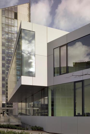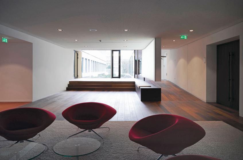Neubau und Bestand wachsen zu einem harmonischen Ensemble zusammen, bei der eine überzogene gestalterische Teilung in Alt und Neu vermieden wird. Die Anschlüssewerden dabei angemessen, keineswegs übervorsichtig, ausgebildet. Durch die Fassade des Saals wird jedoch die notwendige Eigenständigkeit dieses Elements herausgearbeitet. Die Erschließung des neuen Seminarbereiches erfolgt über den Haupteingang und die Halle. Das neue Foyer verbindet die Halle, den Sitzungssaal und den Vorstandsbereich miteinander. Dem Saal vorgelagert sorgt ein Innenhof für ein lichtdurchflutetes Foyers und den erforderlichen Brandschutzabstand zur aufsteigenden Fassade des bestehenden Baukörpers.